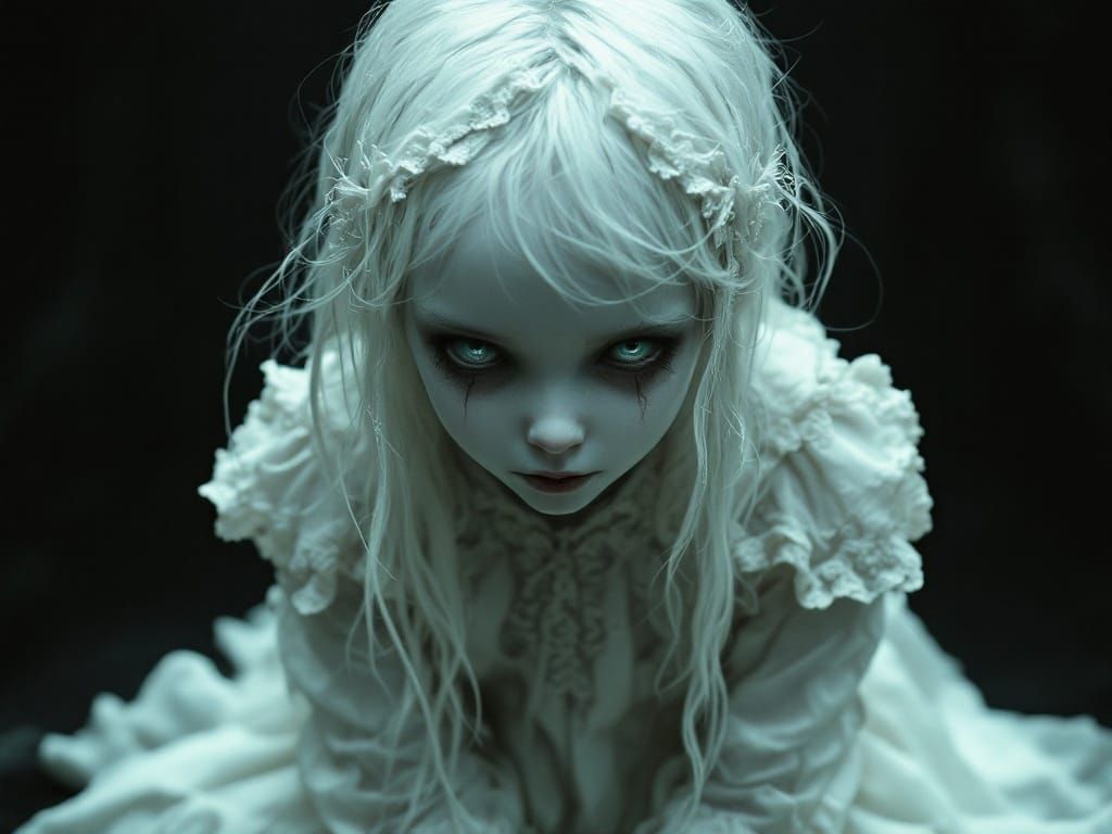 A haunting image of a young girl in a long white dress, her eyes locked onto the viewer with an eerie stare, evoking a sense of horror and unease in a style reminiscent of dark, atmospheric art