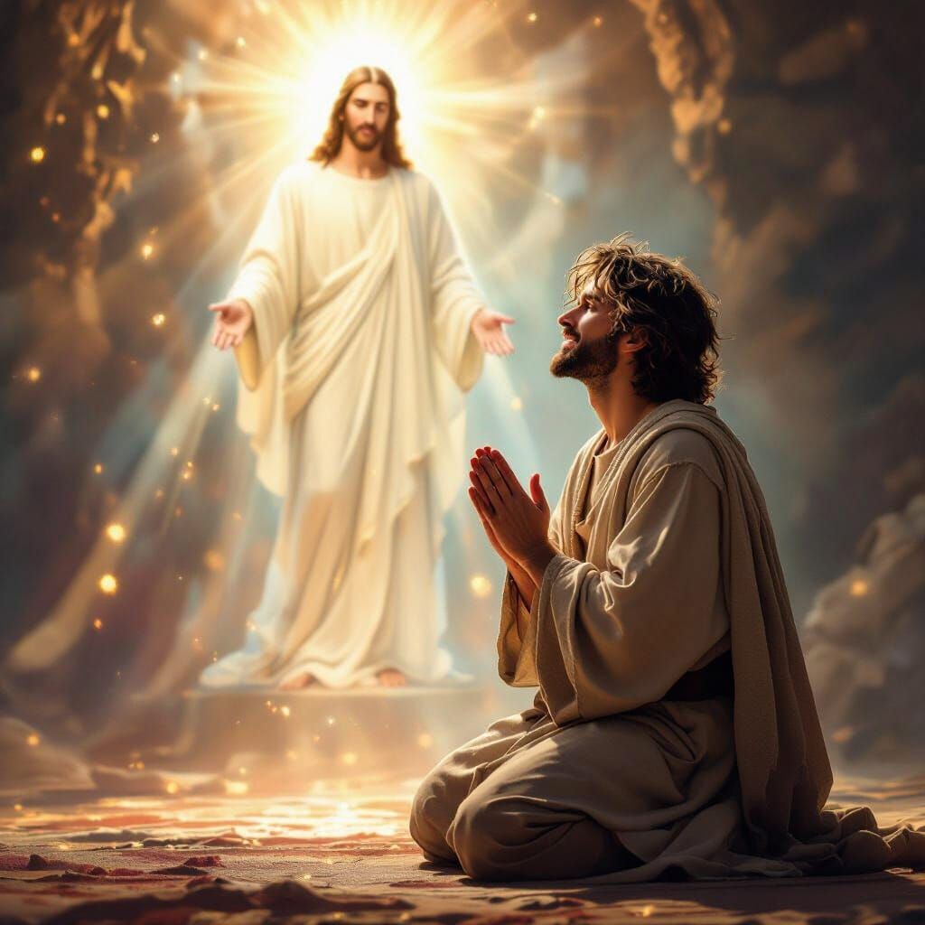 A photorealistic image of King David kneeling in worship before an ethereal Jesus, bathed in soft, golden light. Intricate details and deep colors create a divine, fantastical atmosphere.