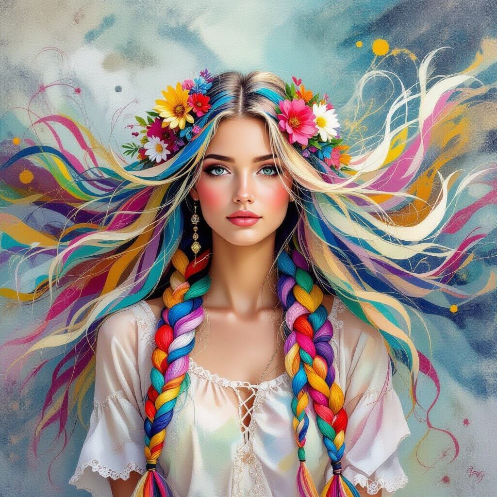 This image showcases a creative, surreal depiction of a woman with long, intricately braided, and vibrantly colored hair, embodying unmanifested dreams.