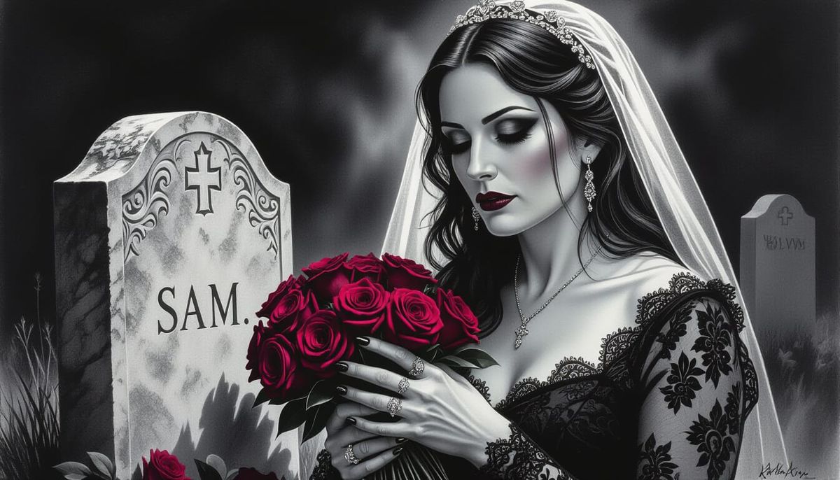 This hyperrealistic charcoal drawing depicts a middle-aged goth woman visiting her wife's grave, holding dark roses. Moody lighting emphasizes emotional depth and texture, in the style of Goya and Kollwitz.