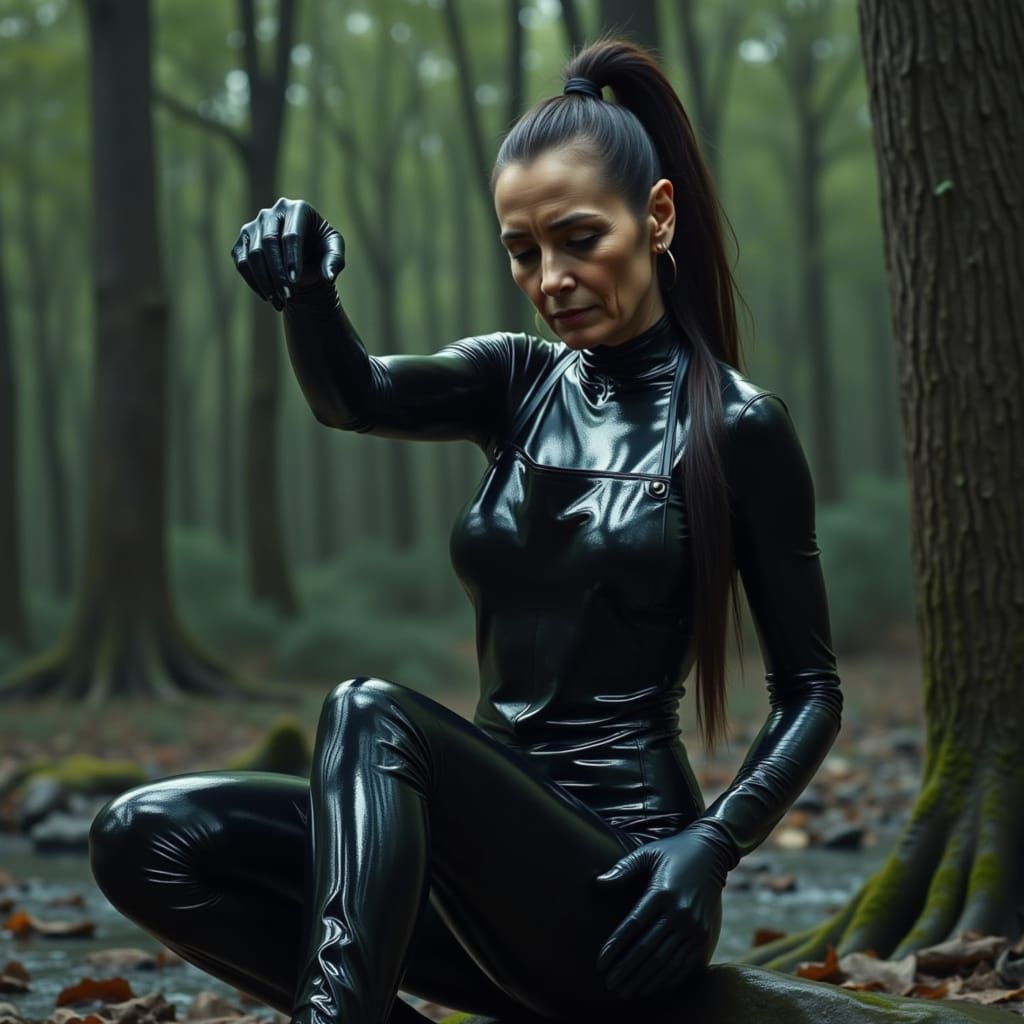 This image features a figure in black latex clothing. The image showcases the textures and reflections of the latex material, emphasizing its sleek and modern aesthetic.