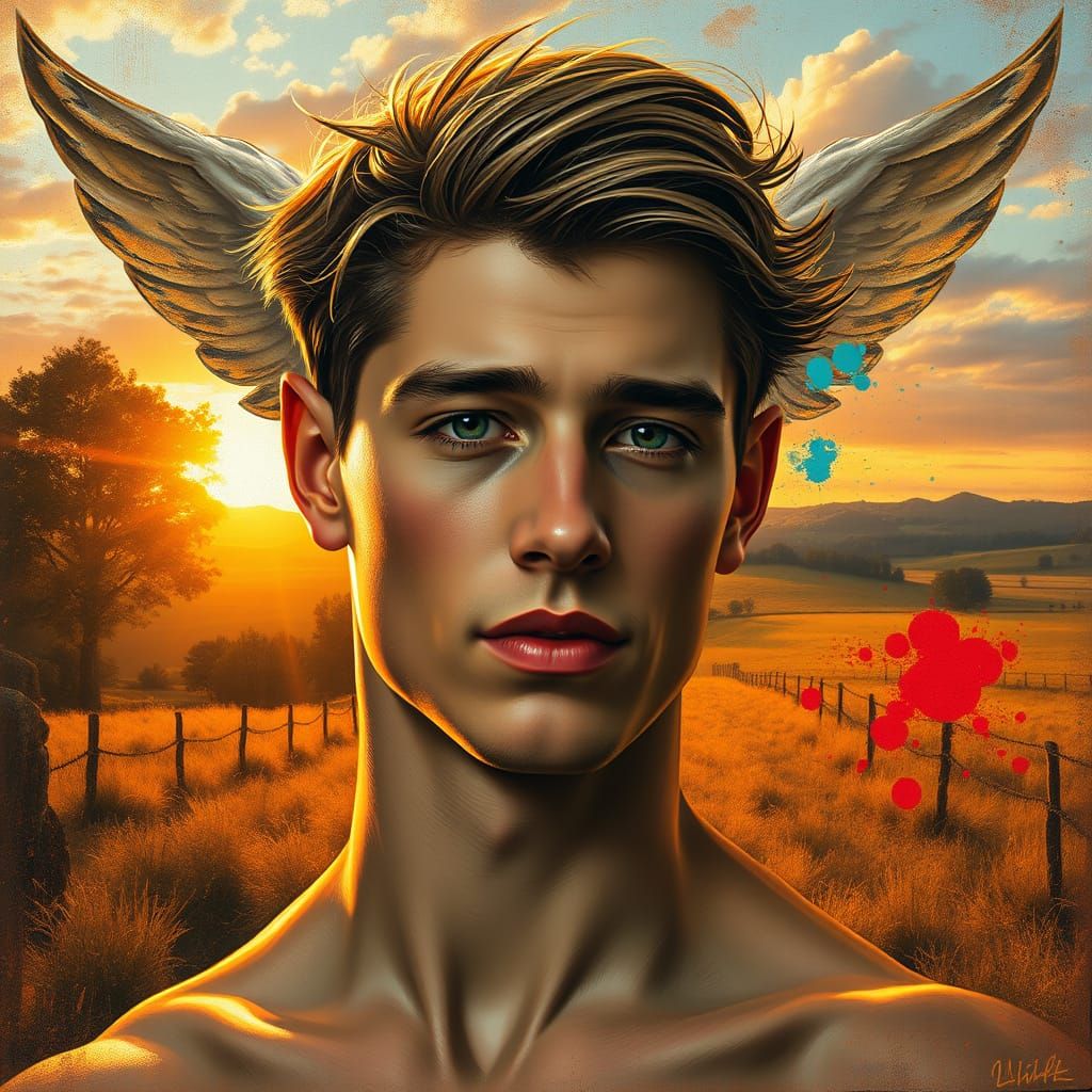 This image shows a Renaissance-inspired portrait of a young man amidst a serene pastoral landscape, blending soft brushstrokes with thick textures and vibrant graffiti art, evoking high contrast and a polychromatic color palette.