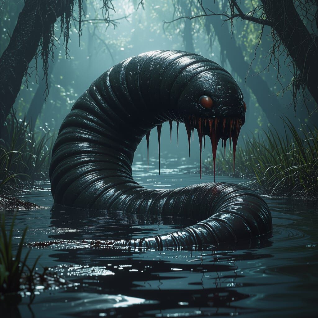 This dark fantasy horror image features a grotesque, giant swamp leech with glistening skin in black water. Rendered as a detailed matte painting with deep colors.