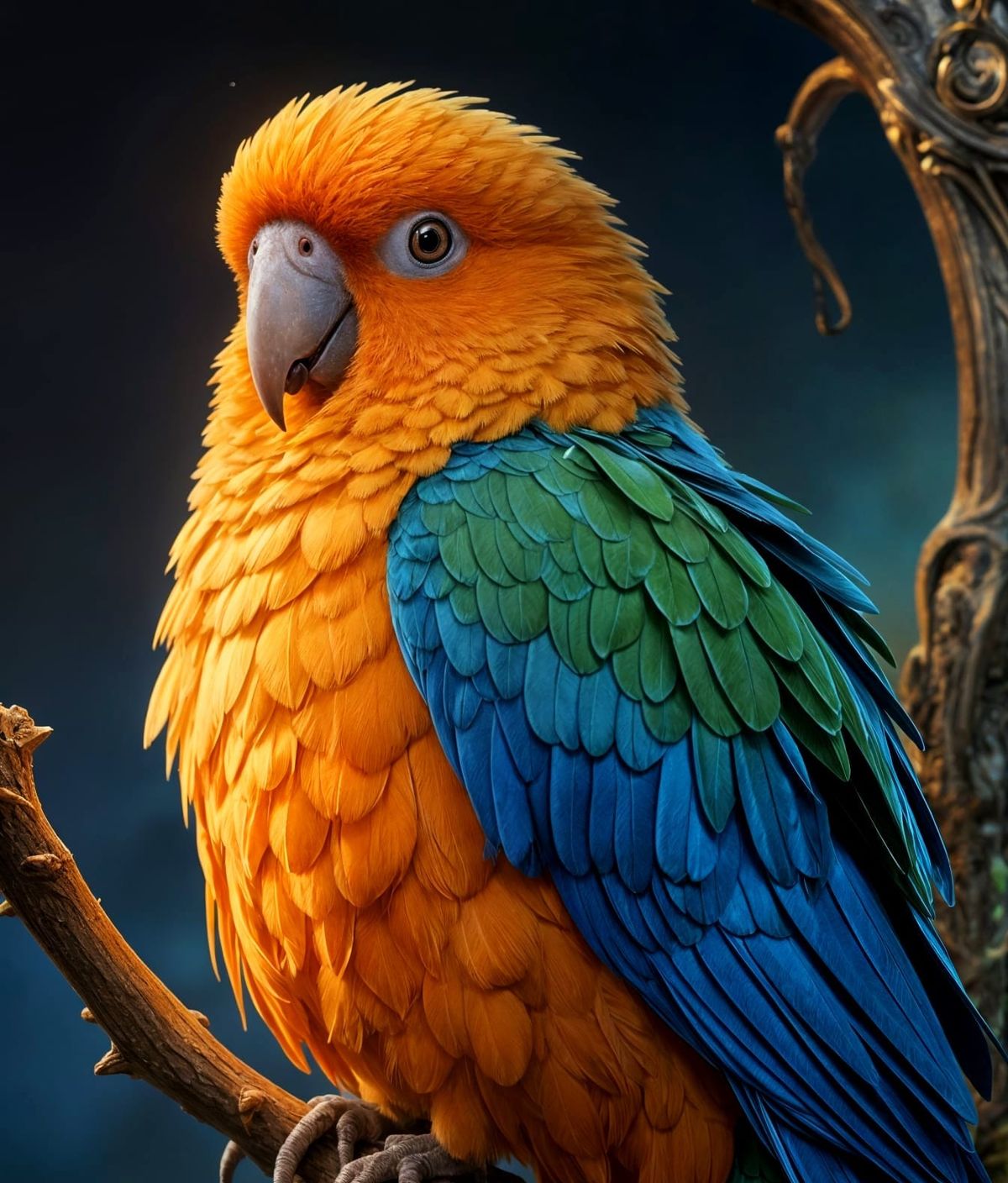 A digital rendering of Sorceress from Masters of the Universe, depicted as a parakeet. The bird has white head and body feathers, striking orange wings and tail, and blue legs and talons.