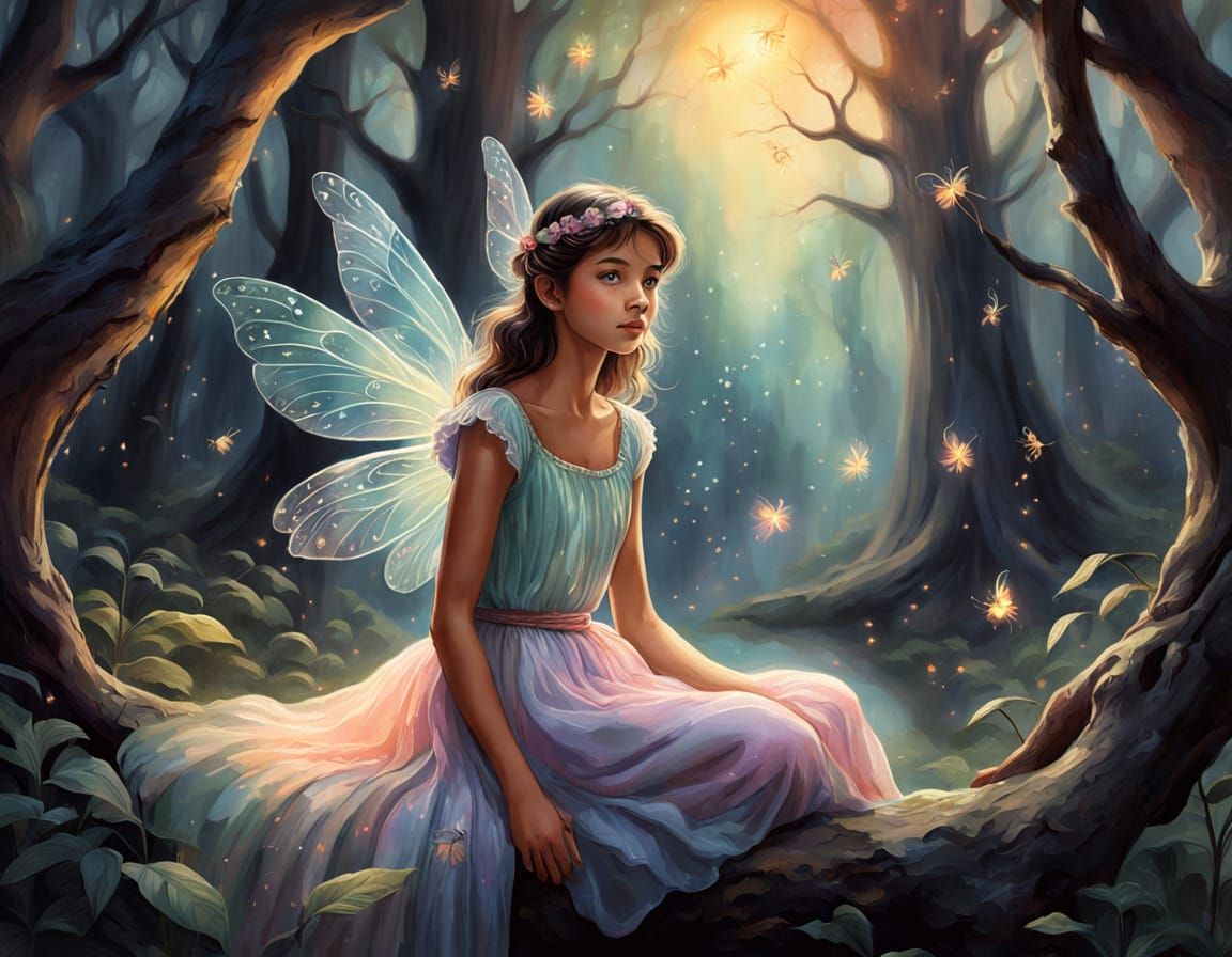 A vintage airbrush art image of a fairy surrounded by fireflies in an ancient forest. The artwork features dreamy pastel watercolor hues and soft, shimmering textures in an 80s aesthetic.