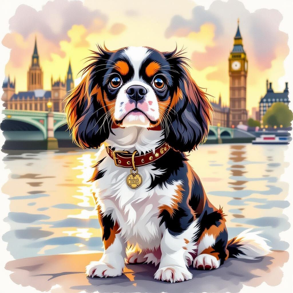 This image shows a watercolor painting of a Cavalier King Charles Spaniel with large eyes and a fancy collar, sitting by the River Thames in London. The artwork features a charming storybook style with warm, golden light and detailed focus.