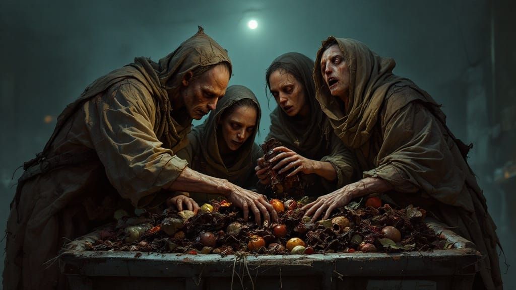 This image shows desperate people scavenging for food in a post-apocalyptic wasteland, illuminated by a faint streetlight, with a muted color palette reminiscent of Zdzisław Beksiński's work.
