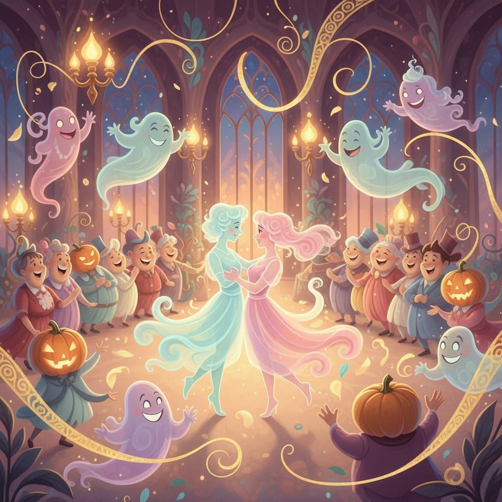 A charming animation-style image of a ghost couple waltzing gracefully amidst smiling spirits and pumpkin guests, bathed in warm, golden light and soft painterly textures.