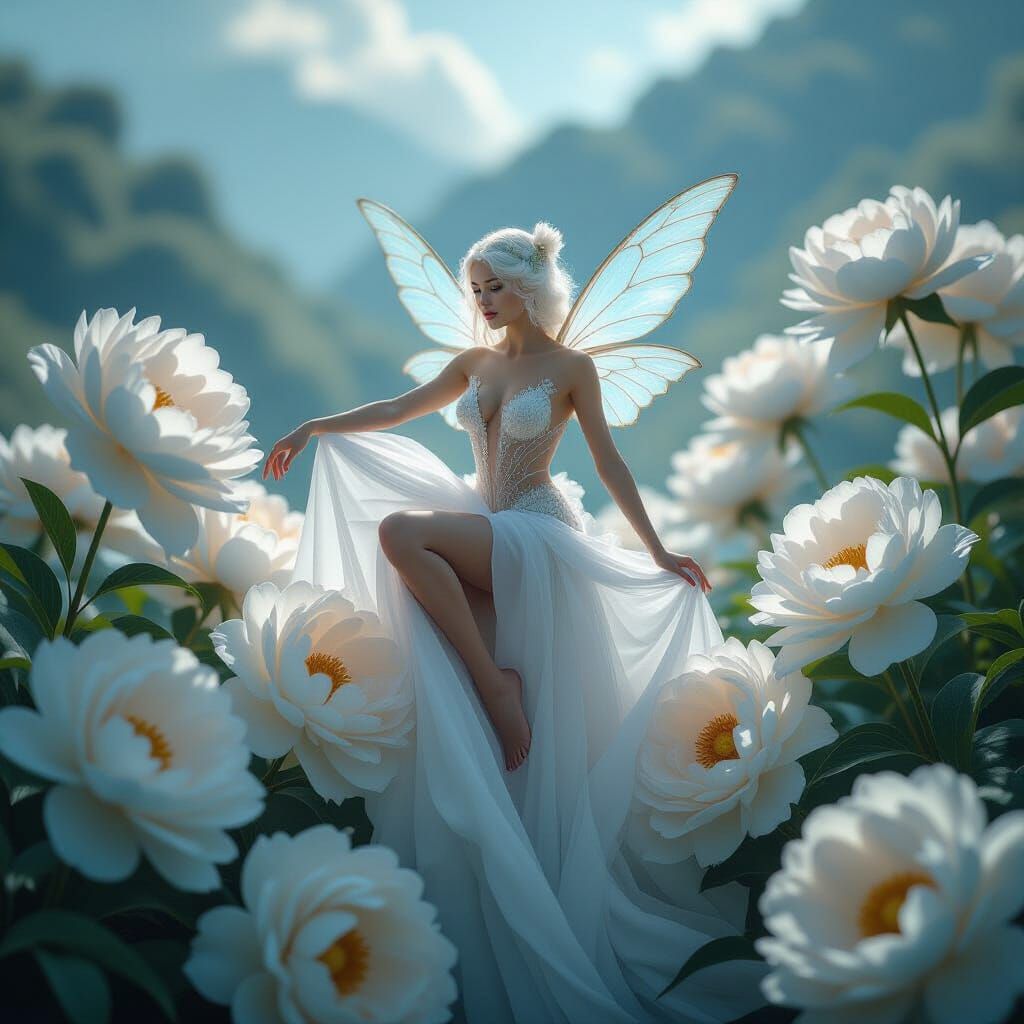 A breathtaking, dreamy image of a translucent nymph with a slender, ethereal silhouette. She is gracefully posed inside a cloud of translucent white peonies, with a strobe effect adding to the surrealism. The neo-expressionist and surreal elements create a captivating scene that transcends reality. The ...