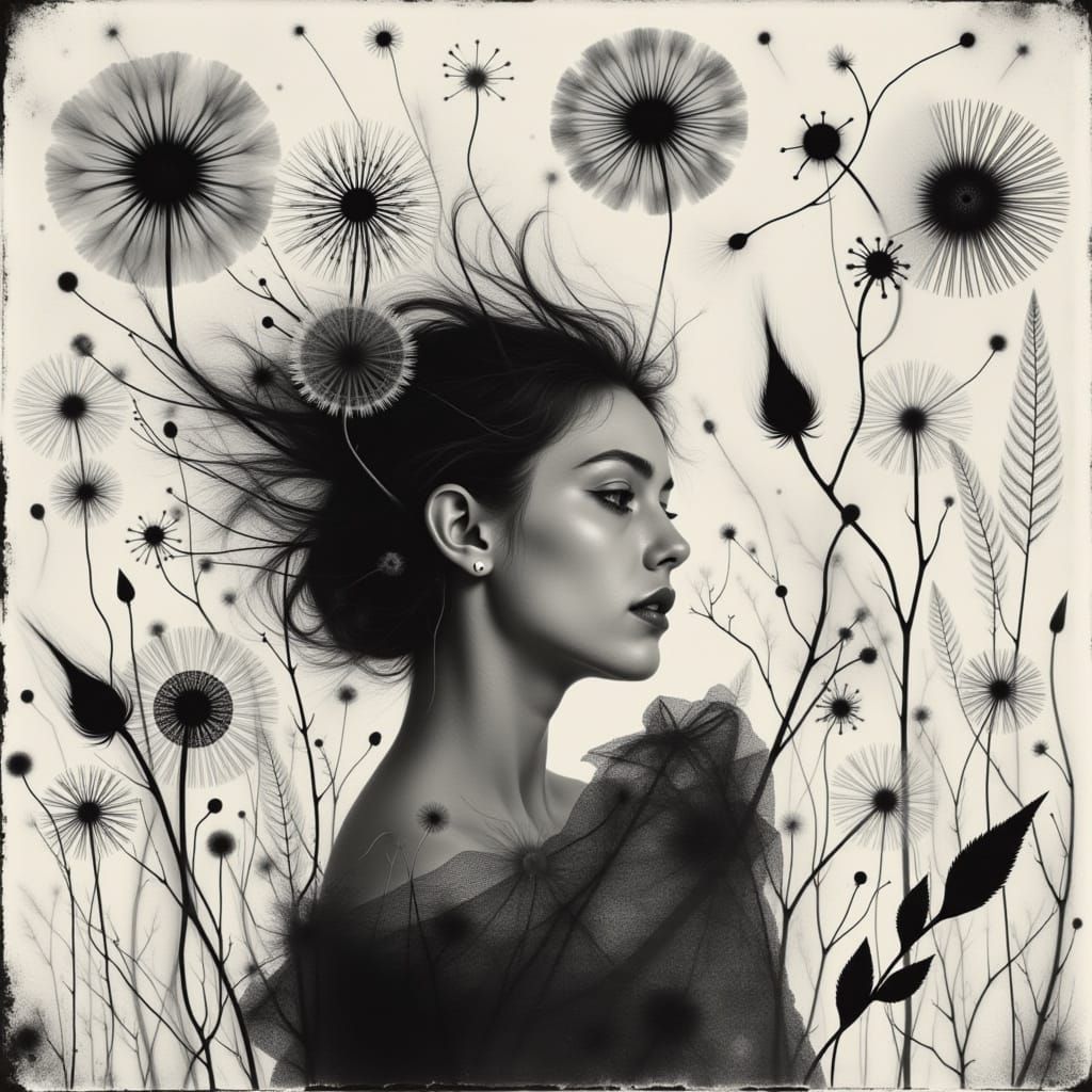 This image shows a woman amid lush botanicals, deep in contemplation. The artwork features whimsical lines, aquatint textures and photogram patterns with surreal, dreamlike and celestial elements rendered in black and white.