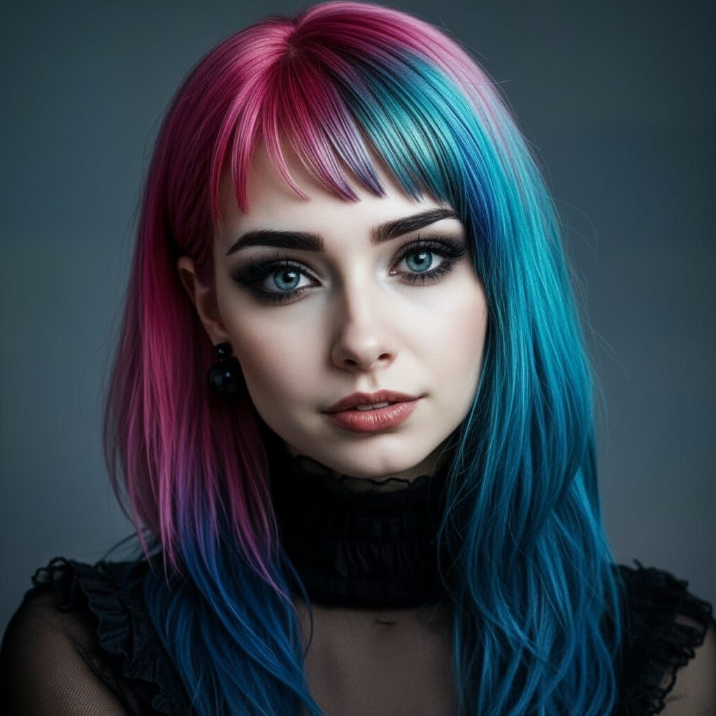 <lora:XxBEAUTIFYxX:1.0> A young woman, appearing to be in her late teens or early twenties with pale skin, is centered in a digitally rendered portrait. She has long, voluminous hair dyed in streaks of bright pink, magenta, teal, and blue, with a sweeping fringe. Her expression is serene, with a subtle, ...
