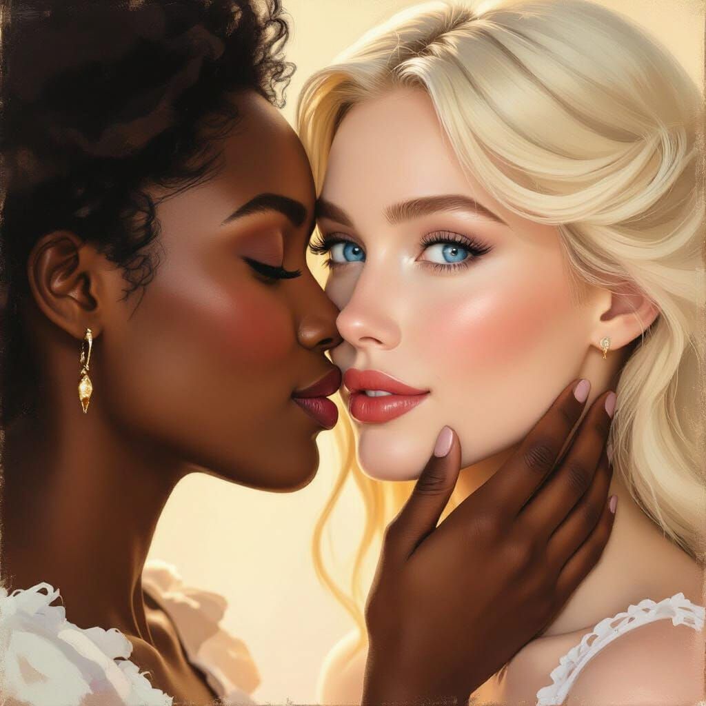 This image captures an intimate moment of a Black woman kissing a blue-eyed blonde woman. Rendered in a painterly, impressionistic style with visible brushstrokes, it evokes warmth and tenderness.