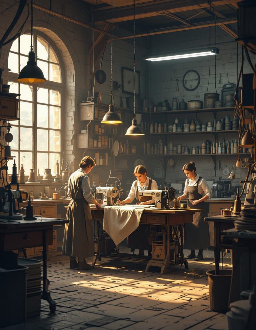 This image shows a dimly lit, dusty sewing shop filled with old equipment and weary people. Rendered in muted grays and warm tones, capturing mundane life in a concept art style.