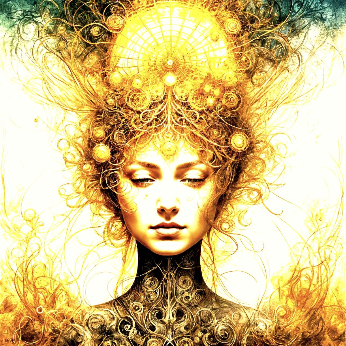 A striking close-up portrait of a surreal, stylized woman. The mixed-media art features fragmented facial features, dreamlike elements, and vibrant threads against a dark background with golden rays.