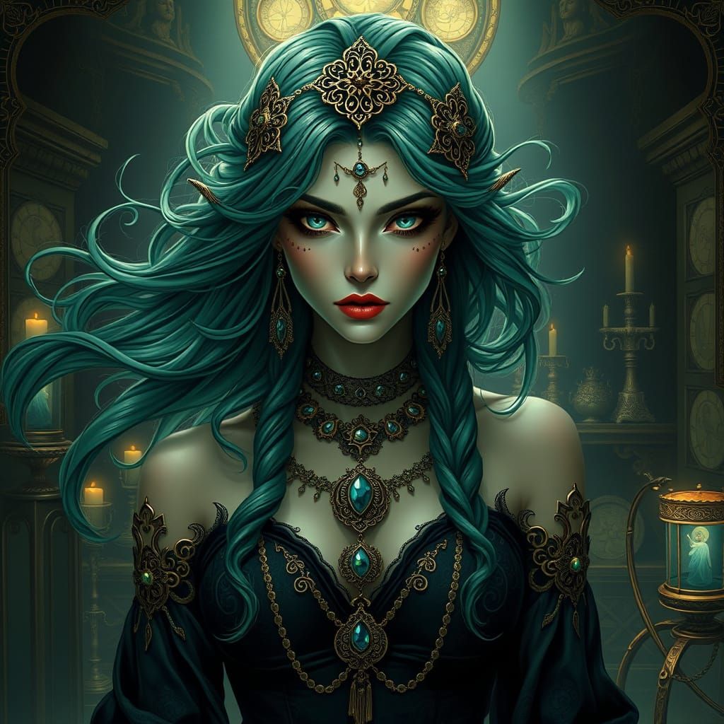 This image shows a vampire woman with turquoise eyes and flowing green hair, wearing filigreed jewelry. The scene features ancient artifacts and mystical symbols in a dark fantasy aesthetic.