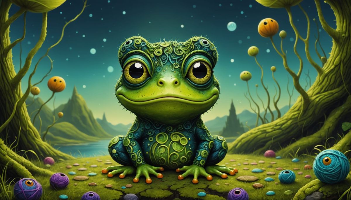 A whimsical image of a surprised frog with large, sad eyes and a green mohawk, wearing gothic-punk clothes. This fairytale scene features vibrant colors and fine details in a surreal, abstract style.