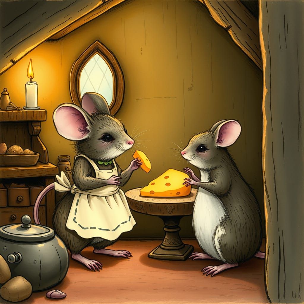 This image depicts a timid mouse wearing an apron offering cheese to a seductive female mouse in an attic. The scene has a Beatrix Potter-like aesthetic with candlelight.