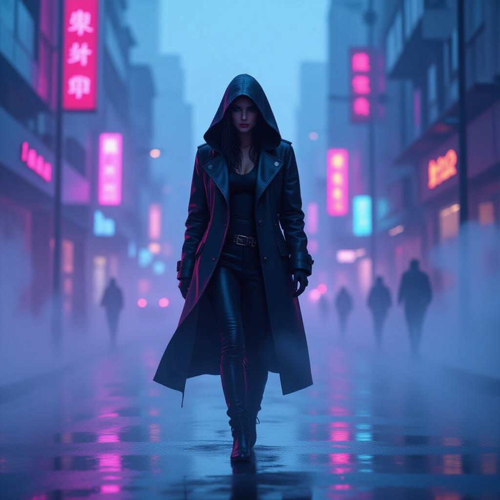 A striking picture of a woman in a long coat standing in neon-lit fog. The image is rendered as an oil painting with vibrant colors and dramatic shadows, in a cyberpunk aesthetic.