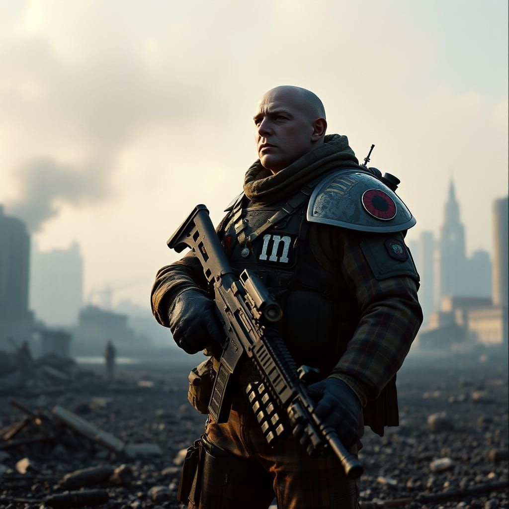 This image shows a rugged, diesel-powered soldier standing strong amidst a ravaged cityscape, their tartan-patterned armor a testament to their unyielding resolve. Shot on virtual 35mm film, with deliberate film grain and cinematic color grading, this dystopian scene is a masterful blend of science ficti...
