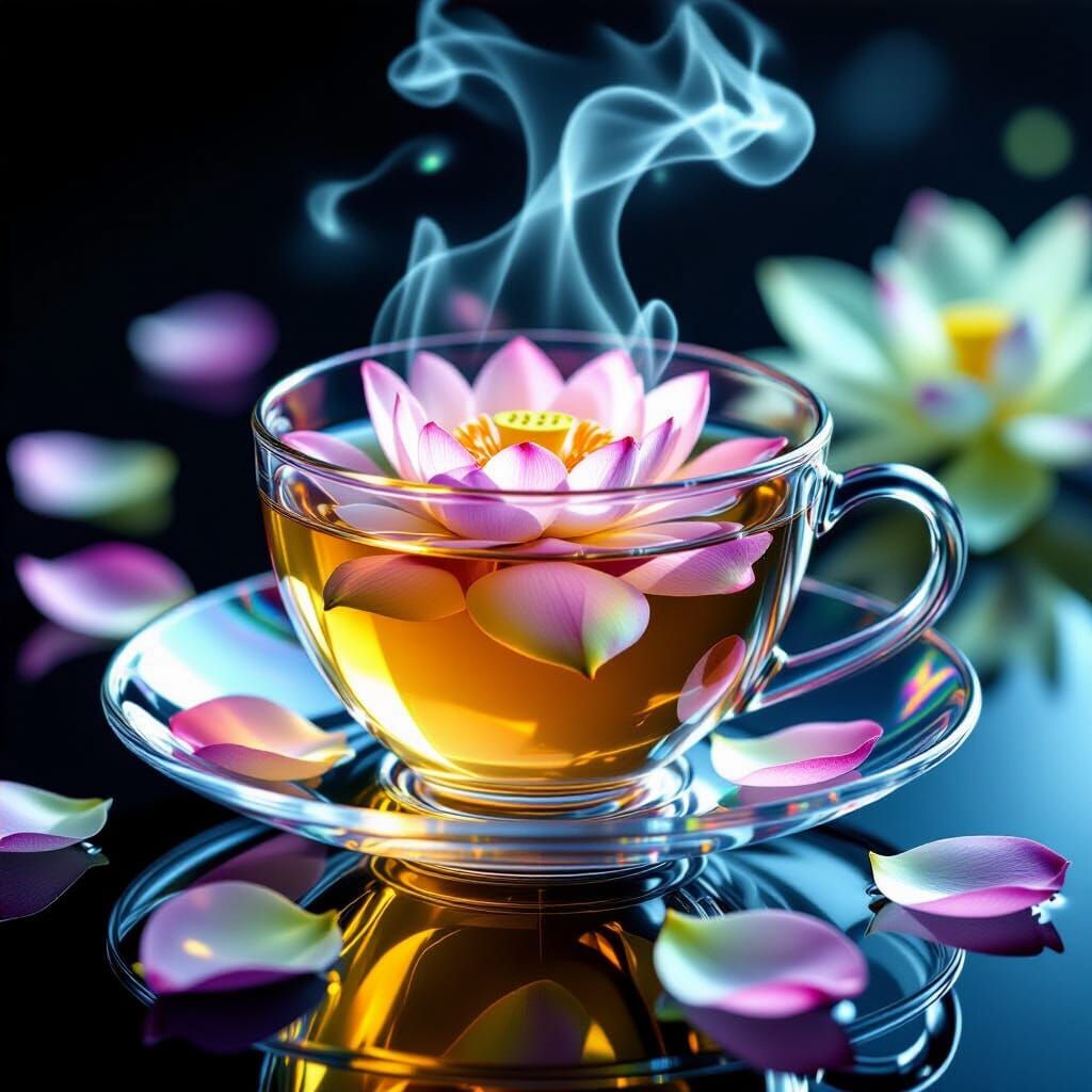 This macro photograph showcases a crystal tea cup filled with green tea, rose petals, and a lotus flower. Luminescent smoke rises from the festive beverage against a black background, with detailed volumetric light.
