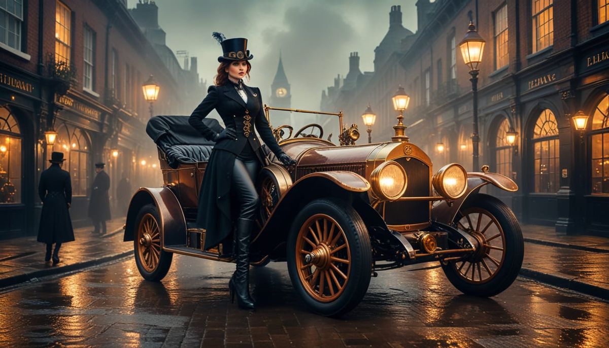 This cinematic photograph captures a confident steampunk woman in Victorian attire, posing before an ornate brass and copper car on a misty London street. The image blends historical and futuristic elements.