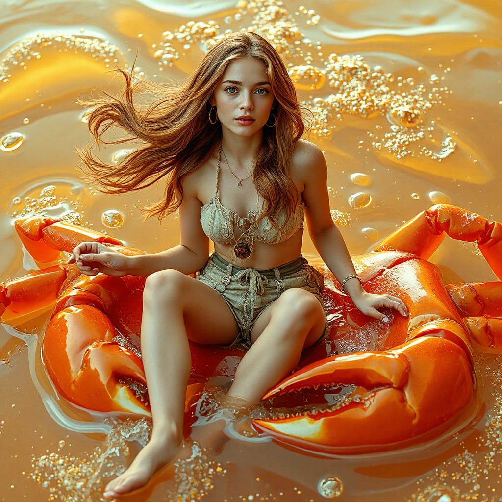 A youthful woman with golden hair and bohemian clothes sits on a giant gummy crab in a surreal sea of bubbly soda. The scene features warm, glowing colors and a dreamlike, ethereal atmosphere.