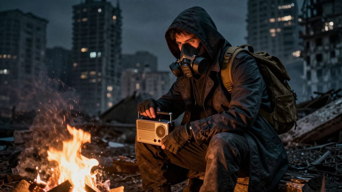 This image shows a photorealistic concept art depiction of a lone stalker in a respirator mask, sitting by a campfire in a desolate, ruined city at night. Moody lighting and a desaturated palette create a gritty atmosphere.