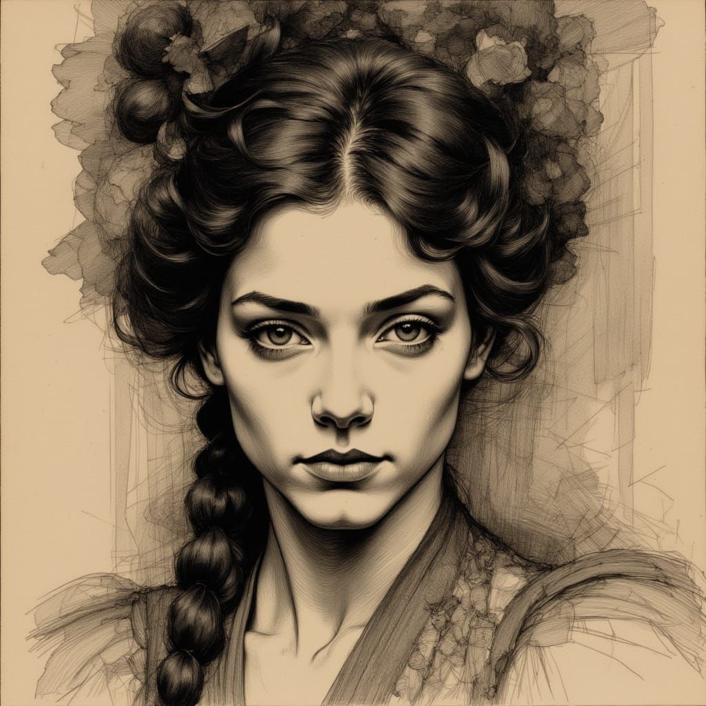 This image showcases a beautiful Victorian woman's portrait, rendered as a gestural pencil and charcoal sketch with dynamic lighting and dark, natural colors.