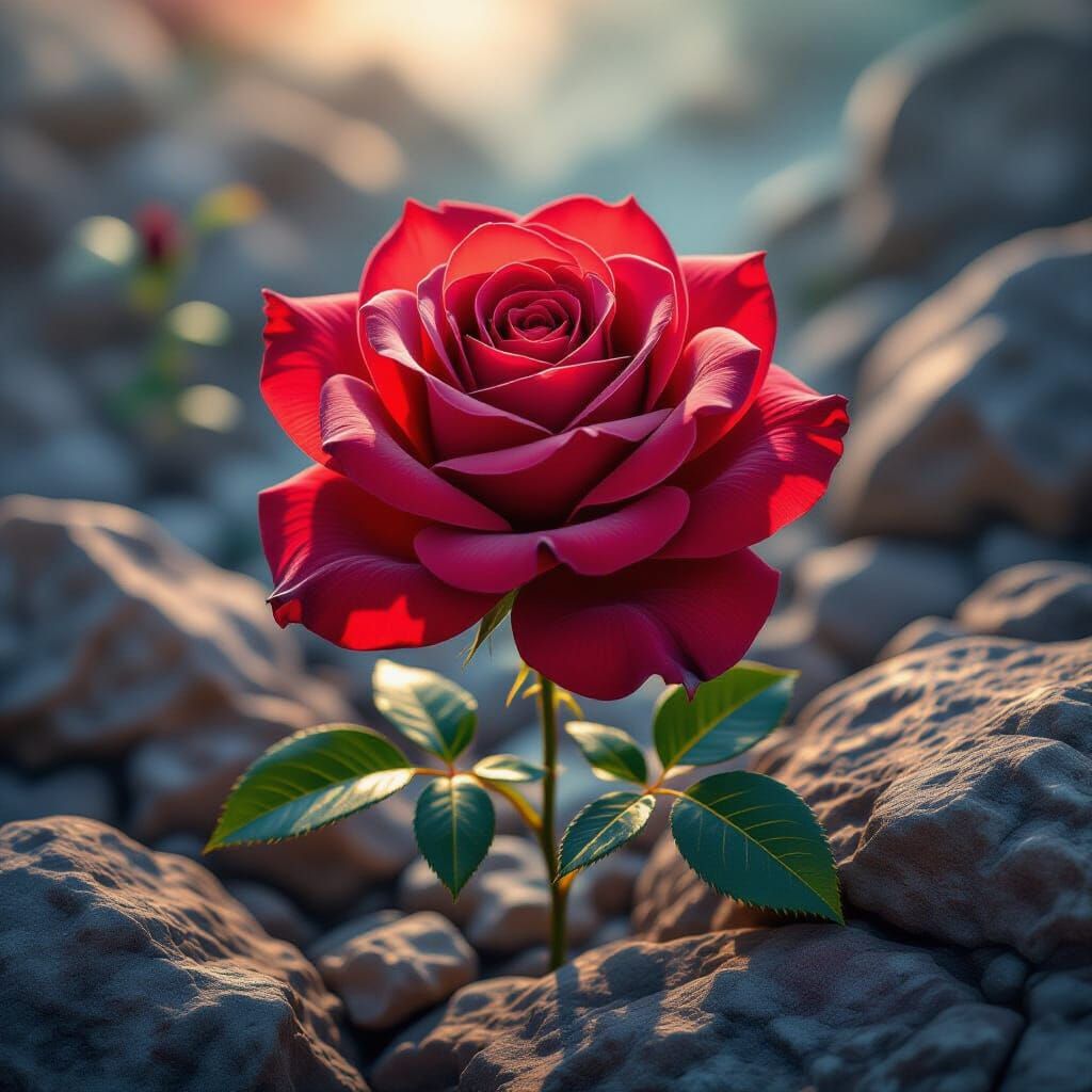 Hyperrealistic image of a vibrant red rose with velvety petals, growing among rough stones. Features dramatic lighting and a dynamic, colorful background. Rendered in a splash art style.
