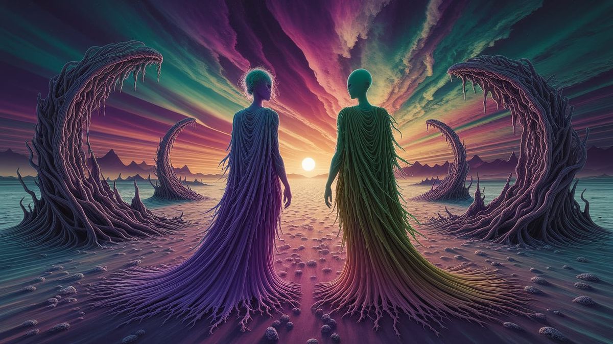 This image depicts a mystical, otherworldly scene with dual figures standing at the edge of a desolate dreamscape, surrounded by biomechanical ruins, set against a vivid, fiery sky, blending science fiction and mysticism in a dreamlike atmosphere.