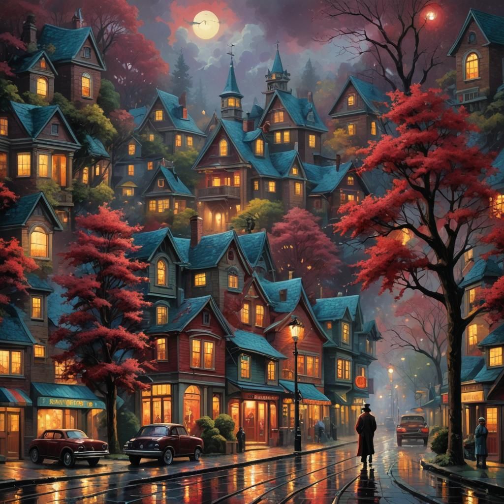 Comic Noir Expressionism crimson hues unique style of Thomas Kinkade