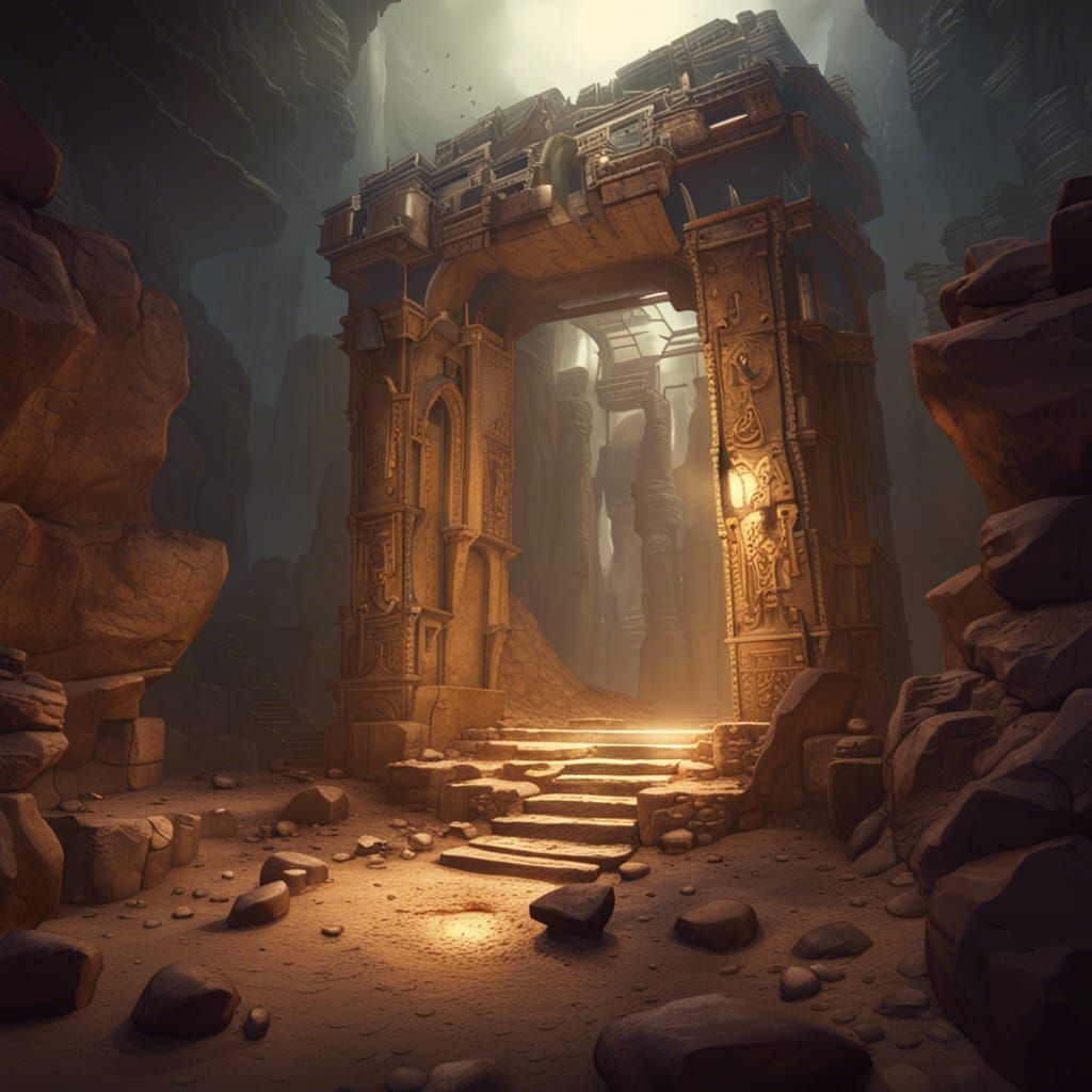 This image shows an archeological dig site that serves as a portal to another dimension. The acrylic art features volumetric lighting in a biopunk aesthetic.