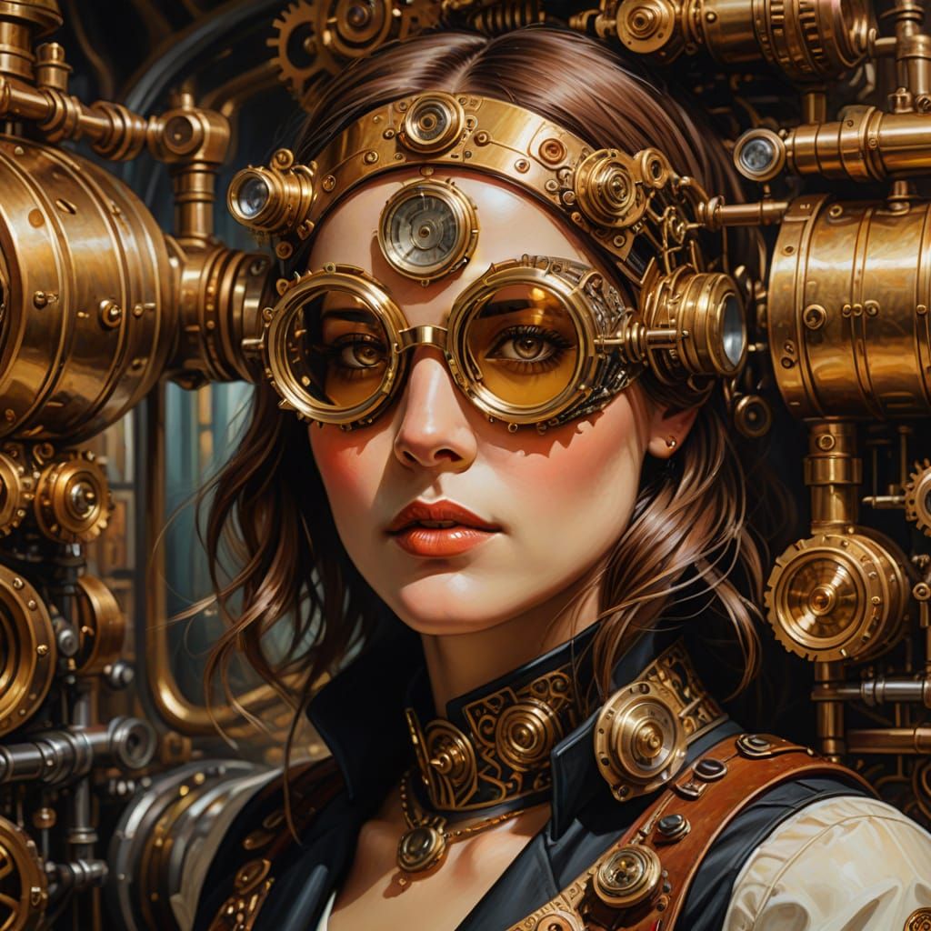 This oil painting showcases a beautiful woman's close-up gaze at intricate steampunk machinery, surrounded by warm, earthy tones and soft vintage lighting, creating a masterpiece of industrial elegance.