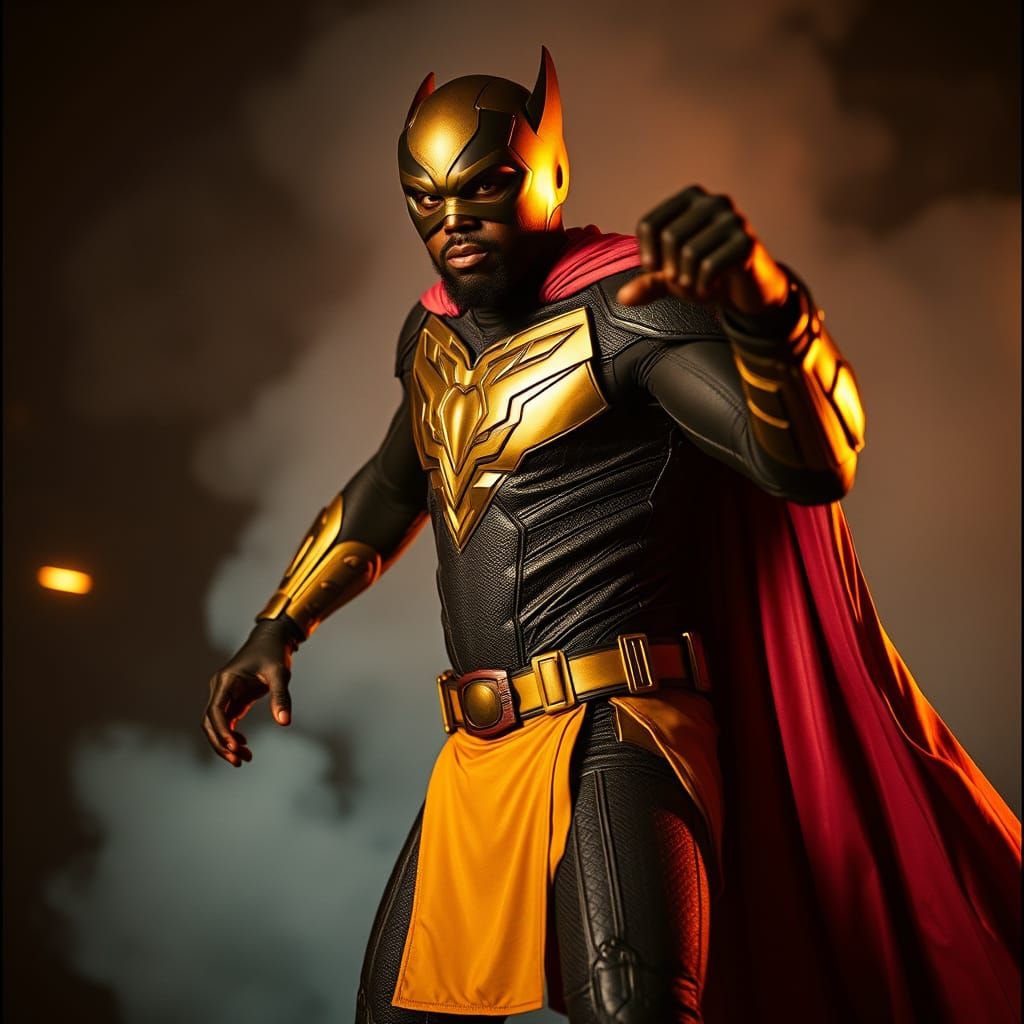 This image captures a dynamic superhero pose, set against a dramatic backdrop, with intricate costume details and cinematic lighting, reminiscent of Denis Villeneuve and Christopher Nolan's filmic aesthetic