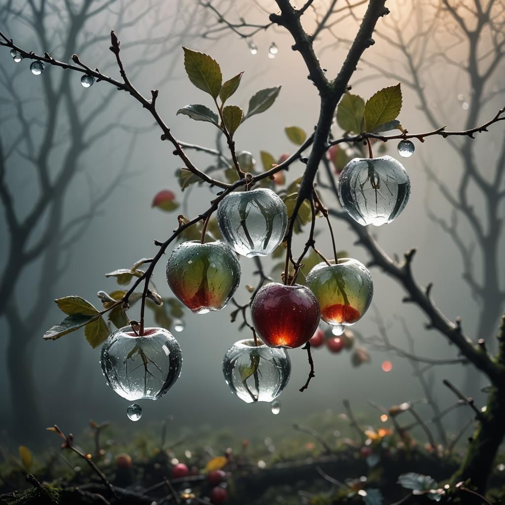 This image shows crystal apples on a branch in a misty atmosphere. The photograph features delicate water droplets, soft light, and a warm color gradient in a cinematic style.