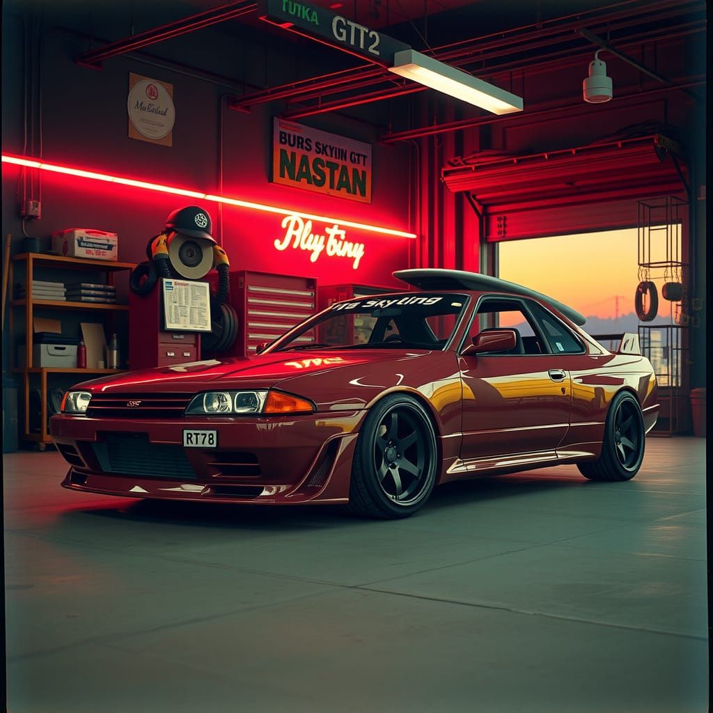 A vibrant image of a Nissan Skyline GTR RB28 with HKS tuning in a retro Tokyo workshop, set against a warm neon sunset. The image is reminiscent of surf nostalgia, with a distressed film grain effect.
