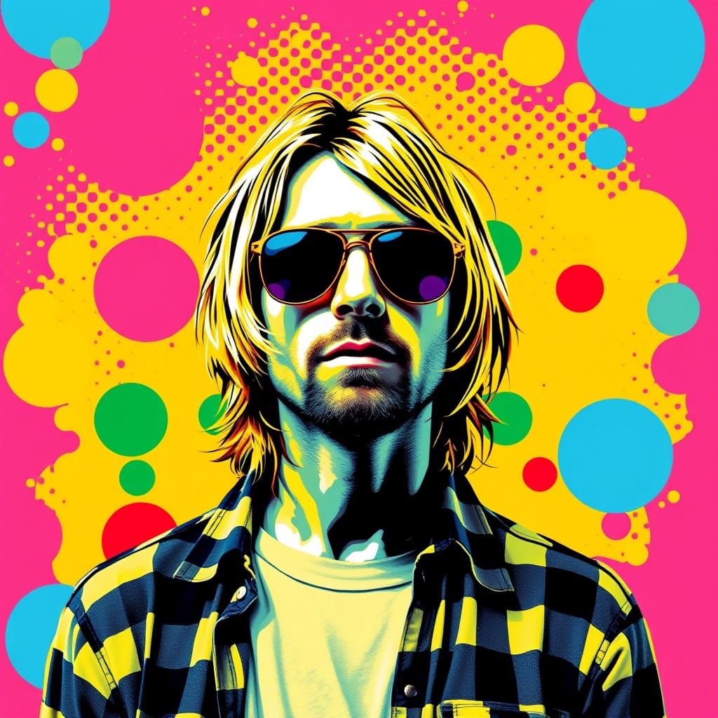 This vibrant pop art portrait features Kurt Cobain in a bold, graphic setting, inspired by the iconic styles of Andy Warhol and other influential artists.
