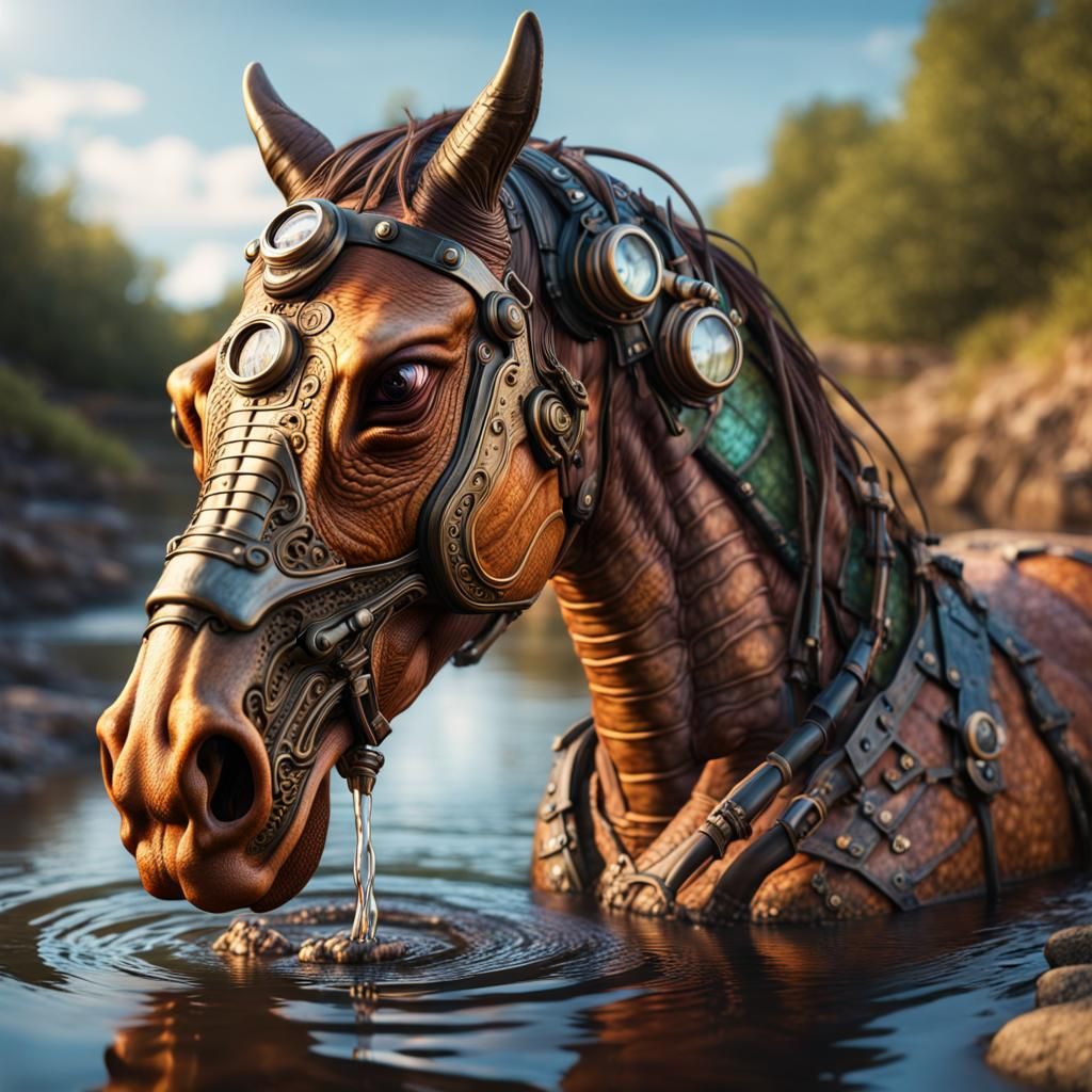 This image shows an alien reptilian horse in steampunk style drinking from a stream. The hyperrealistic rendering features intricate details, dramatic lighting, and a colorful background.