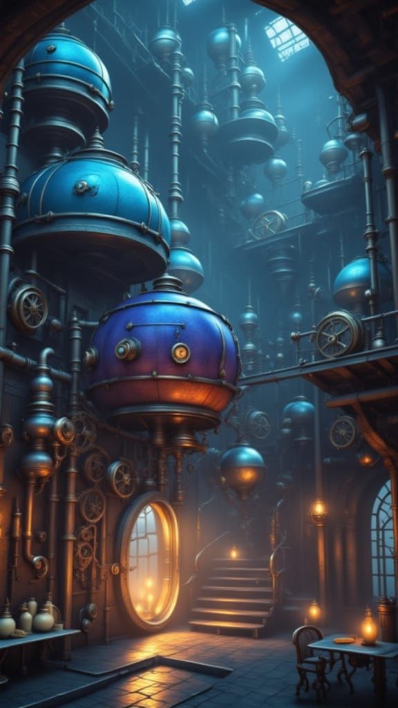 An enchanting steampunk lab filled with ornate machinery and vibrant blue and purple vessels. The scene is illuminated by warm candlelight, creating a mystical atmosphere. The setting features tall ceilings and intricate piping, with beams of light filtering through large, arched windows, casting soft shadows across the room.