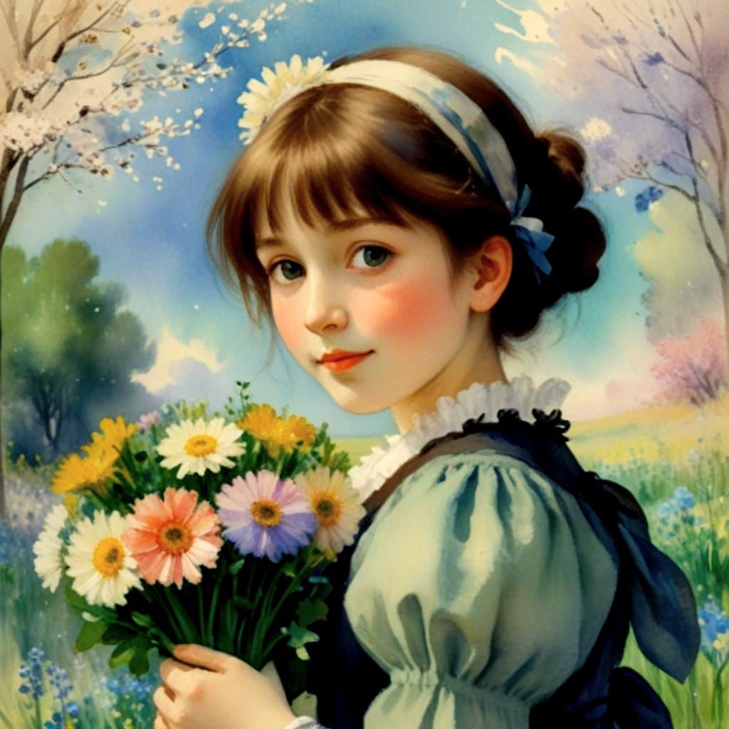 This image shows a happy girl in an idyllic meadow, holding a bouquet of spring flowers. Rendered in an elegant impressionist watercolor style.