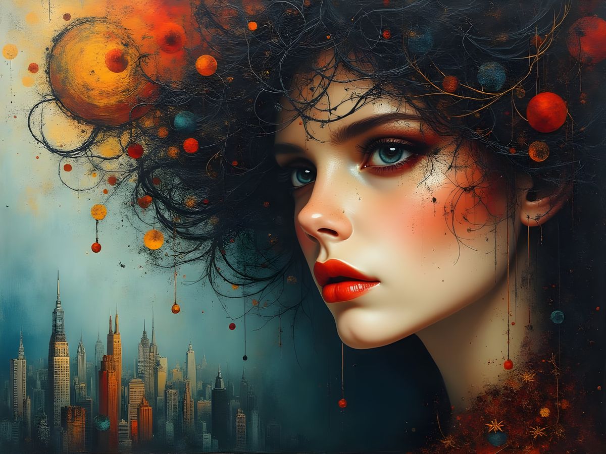A surreal masterpiece depicting a woman with a detailed face, her features dissolving into a swirling vortex of colors and textures, set against a backdrop of a dreamlike cityscape. Her gaze is intense and mysterious. The style is reminiscent of Erté's fashion illustrations, combined with the abstract ...