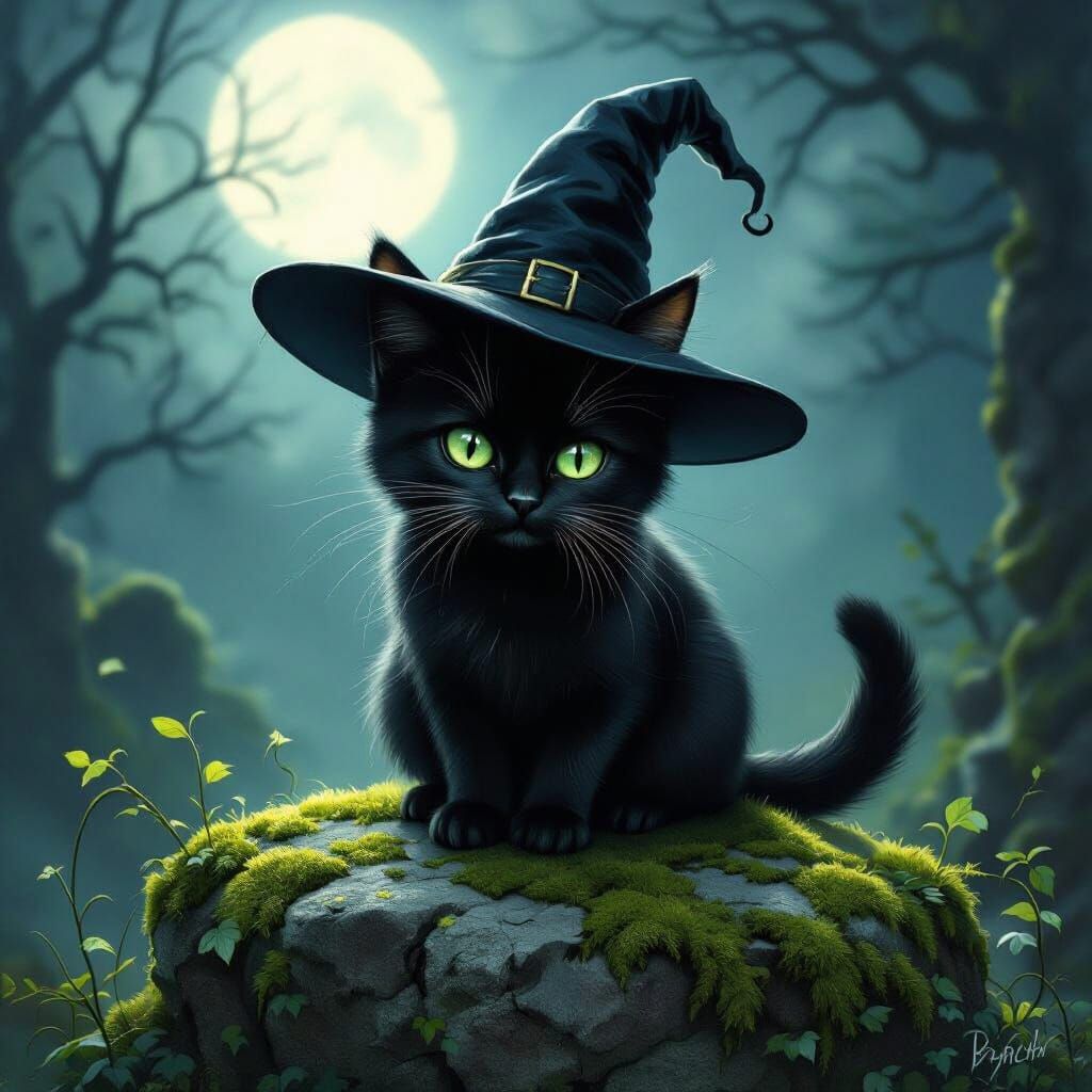 This image shows a small black cat wearing a witch's hat, its dark green eyes glowing. It sits on ancient, mossy stone under a mystical moonlight glow, rendered in a richly detailed fantasy digital painting style.