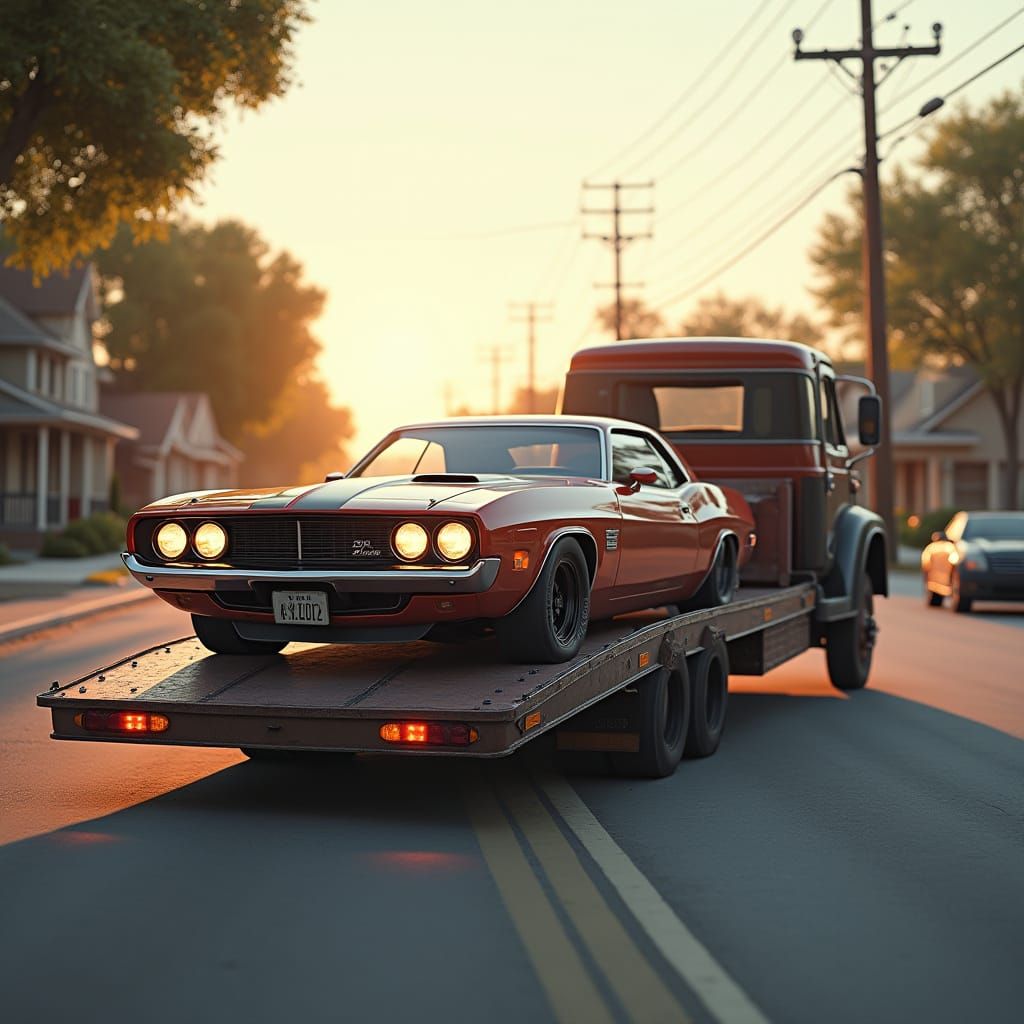 A flatbed tow truck tows a vintage muscle car on a quiet suburban street. The image blends retro futurism with photorealistic details, creating a nostalgic Americana scene.