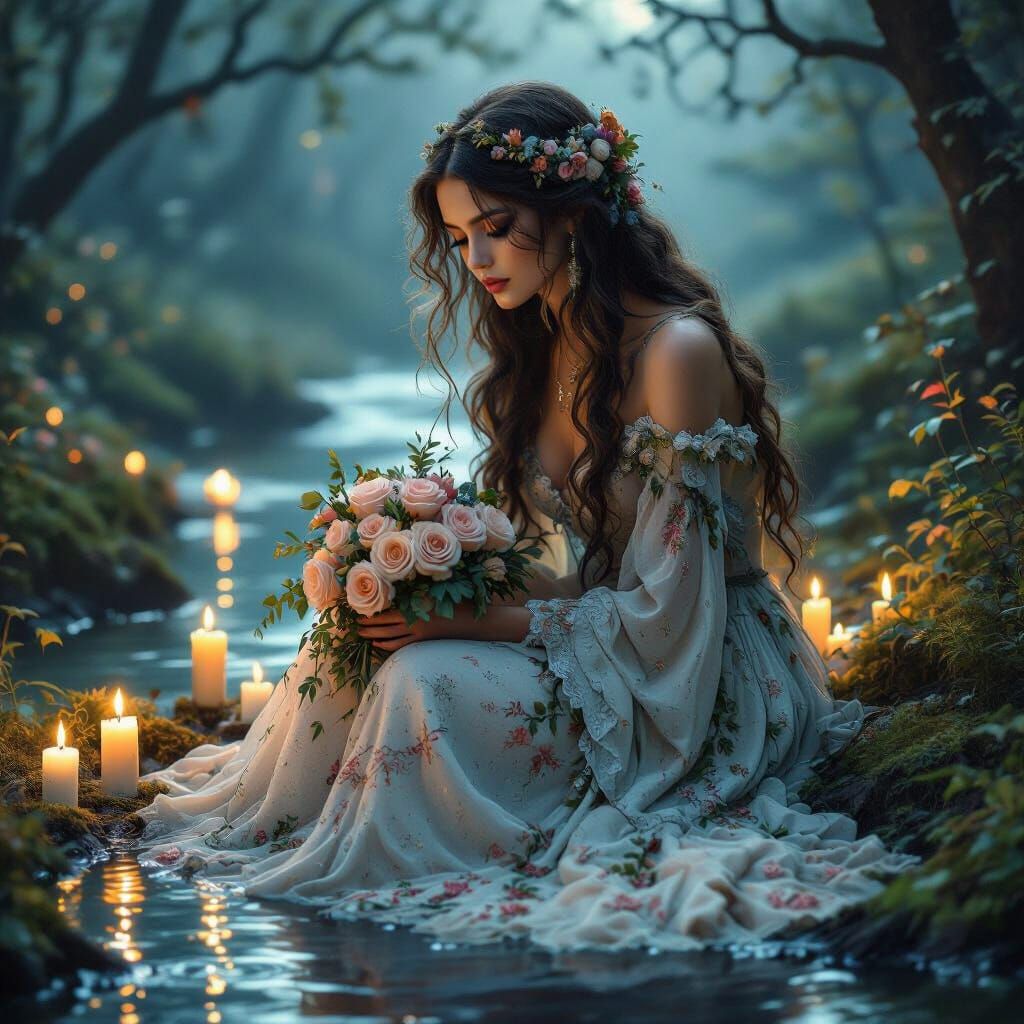 A melancholic woman with long wavy hair decorated with flowers and vines, sitting by a mystical stream at twilight. She wears a tattered, sparkling gown adorned with intricate embroidery and moss, holding a bouquet of faded roses. Soft candlelight surrounds her on the ground, creating a magical ethereal ...