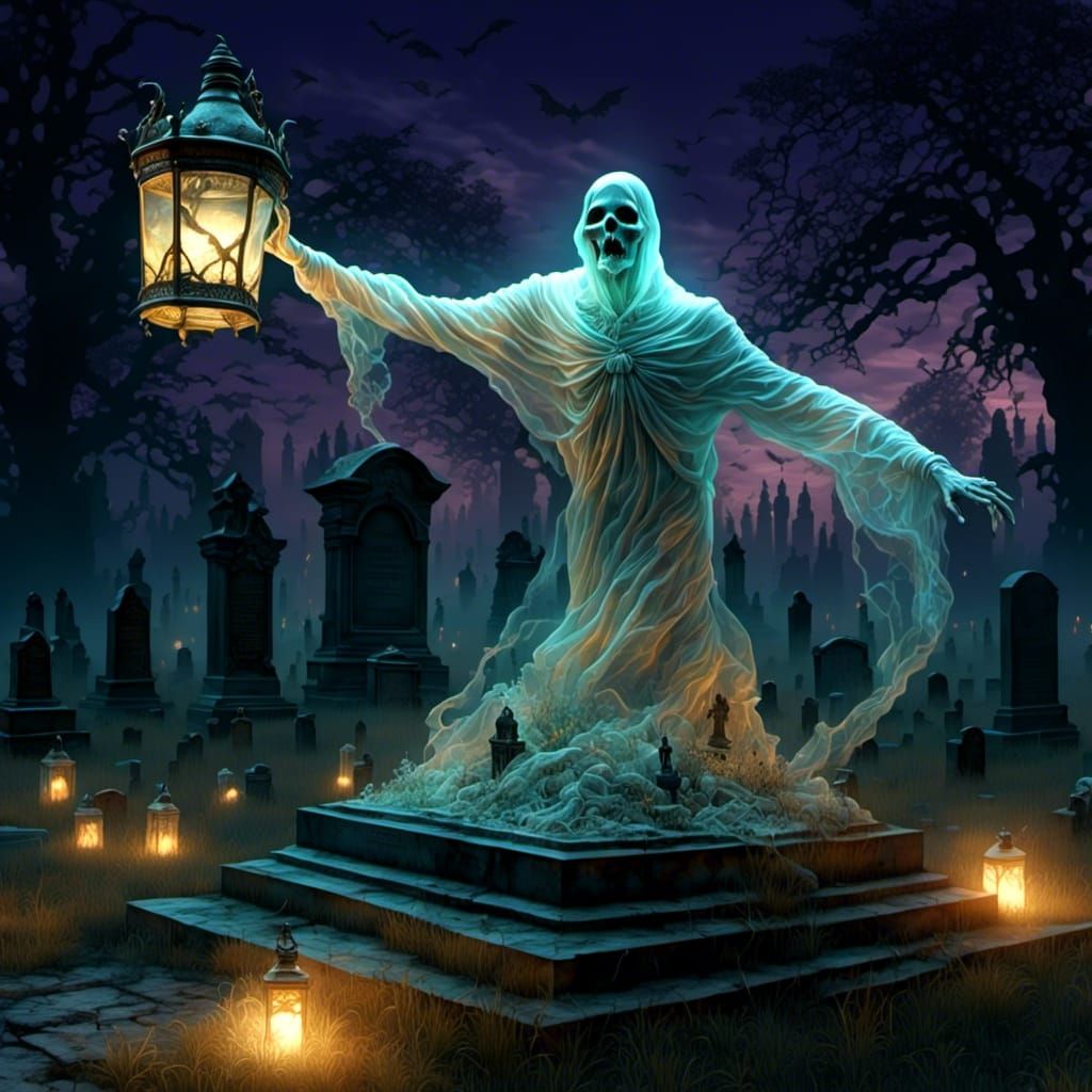 This image depicts a surprising encounter in a twilight graveyard. A demonic figure emerges from a grave, startling a gravedigger holding a glowing lantern. The scene evokes a ghostly atmosphere.