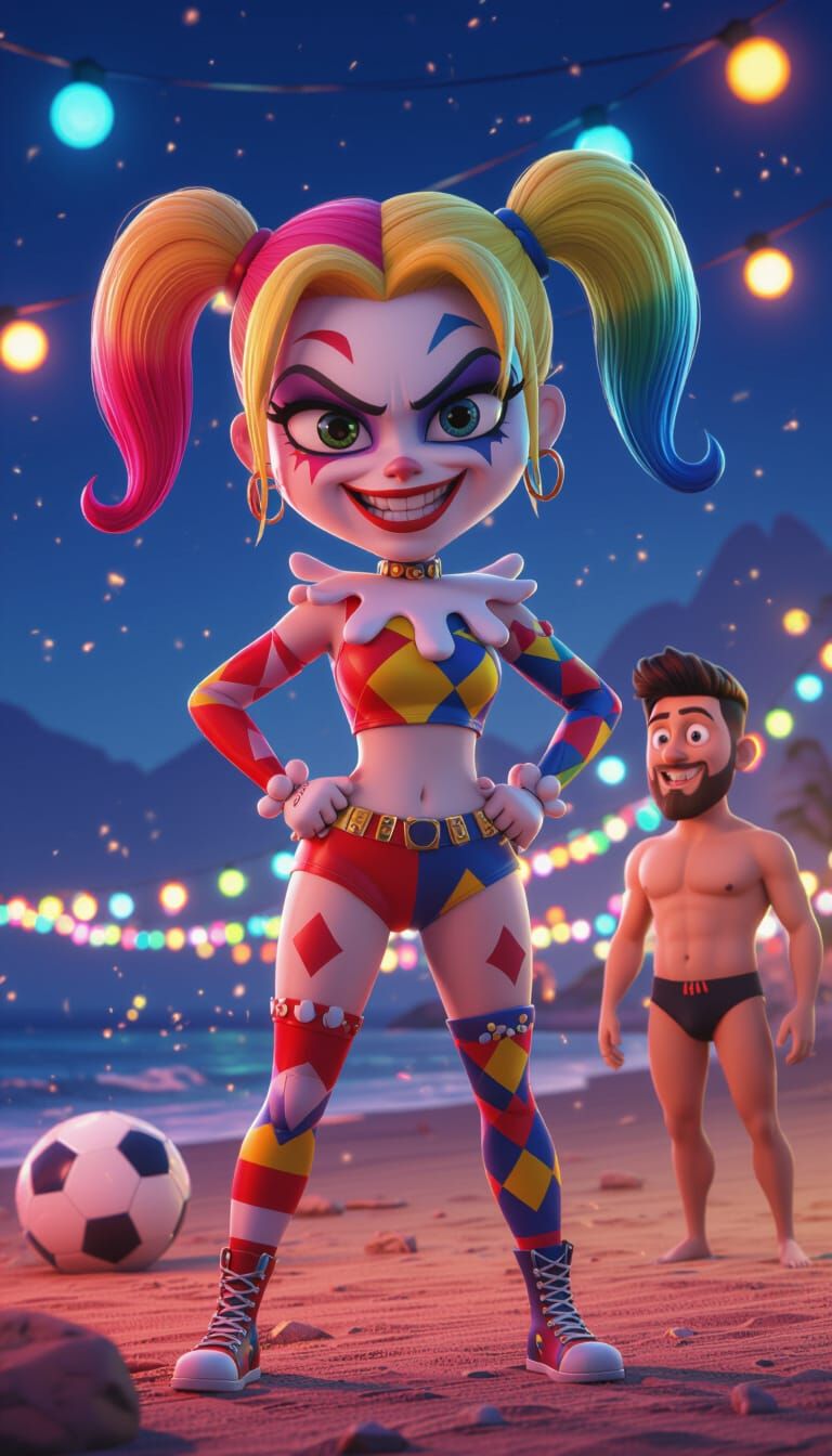 This image shows cartoonish Harley Quinn and Lionel Messi figures at night on a beach with LED lights. The artwork features bold lines, textures, and a vibrant color palette in a whimsical, dreamlike style.