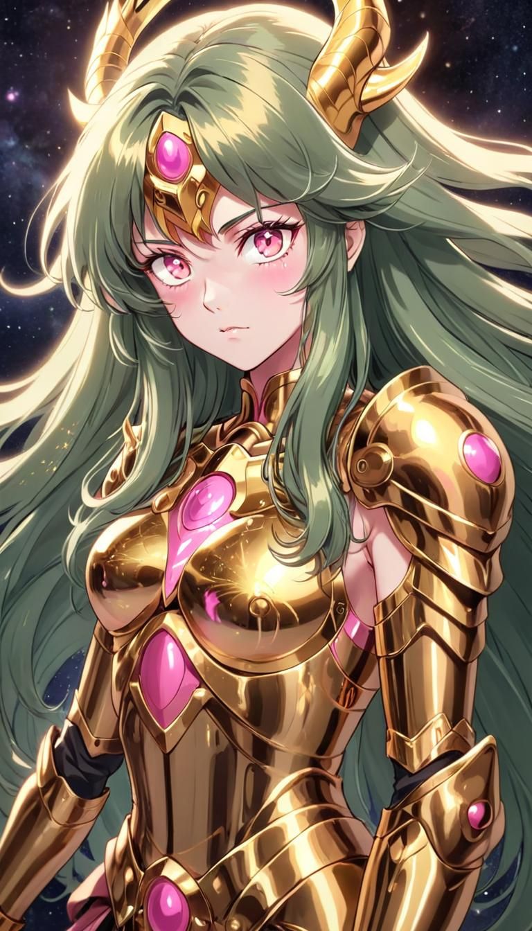 This image shows a beautiful woman with long olive green hair and pink eyes, depicted as a female Gold Knight. The artwork evokes a Saint Seiya anime aesthetic in 8K resolution.