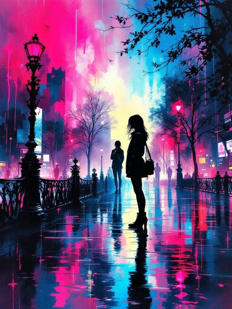 A striking picture of a woman standing in a rainy city park. The image blends detailed line art with vibrant watercolor techniques and luminous reflections, creating an atmospheric and romantic urban scene.