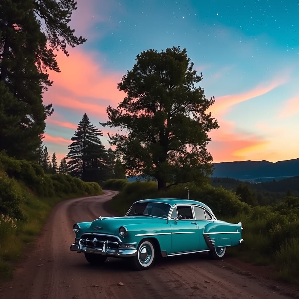 This image captures a serene moment in nature as a vintage teal car is parked on a winding dirt road surrounded by lush greenery and tall trees, set against a breathtaking sunset sky with soft pink and blue hues and a sprinkling of stars.