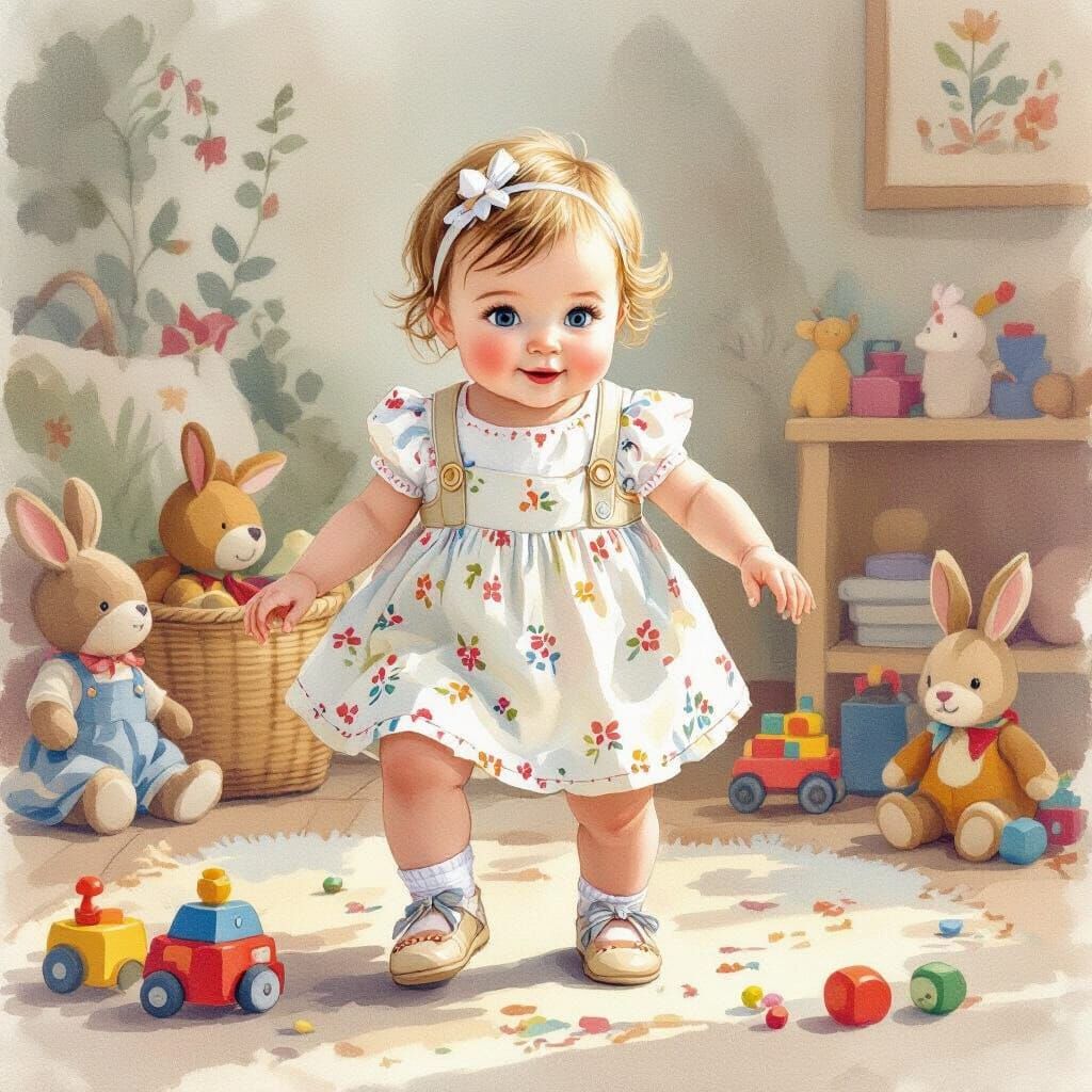 This image shows a baby wearing Archcare shoes and taking its first steps. The setting is warm and nurturing, with a Beatrix Potter-inspired whimsical illustration style.